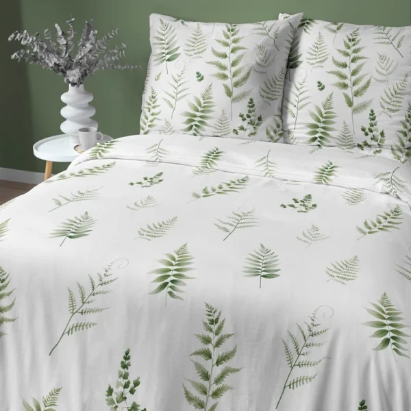 Komplet pościeli satynowej z delikatnym wzorem botanicznym zielonych paproci na białym tle. Elegancka pościel to doskonały dodatek do do sypialni, w jasnych barwach urządzoną w naturalnym kwiatowym lub botanicznym stylu.