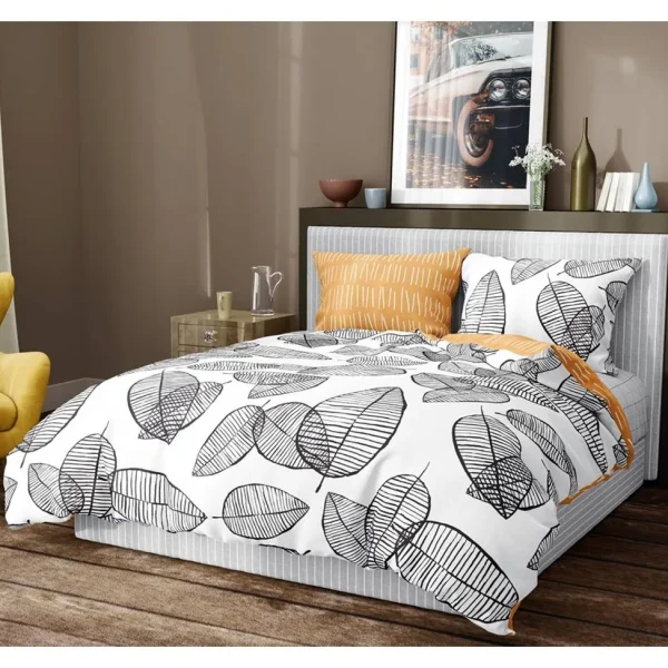 Dwustronna pościel z motywem szkicowanych liści w czarnobiałej kolorystyce z rewersem w kolorze pomarańczowo-musztardowym oraz deseniem w postaci pionowych kresek. Pościel z botanicznym motywem roślinnym liści dedykowana dla dorosłych to wspaniałe uzupełnienie wystroju w stylu skandynawskim, nowoczesnym lub industrialnym. Przeznaczona do sypialni w kolorze białym lub jasnych odcieniach beżu z akcentami o musztardowo-pomarańczowej barwie. Komplety pościeli poszwa + poszewki z motywem liści przeznaczone na łóżka z materacem jednoosobowym i podwójnym w zależności od wybranego wariantu rozmiaru. Na łóżka pojedyncze dostępne warianty pościeli o wymiarach poszwy 135x200, 140x200, 150x200 lub 160x200 z jedną, lub dwiema powłoczkami 50x60, lub 70x80 cm w komplecie. Na większe łóżka z podwójnym materacem dostępne rozmiary poszwy 180x200, 200x200 lub 200x220 z dwiema poszewkami na poduszki. Dostępna również pościeli o niestandardowych rozmiarach poszwy i poszewki. Pościel w liście wyprodukowana ze 100% bawełny, certyfikowana zgodnie z Oeko-Tex standard 100 Tekstylia godne zaufania. Producent pościeli Faro, model Pościel w liście Elegant 004, ean: 5907750591107 (160/200), 5907750591176 (200/220)
