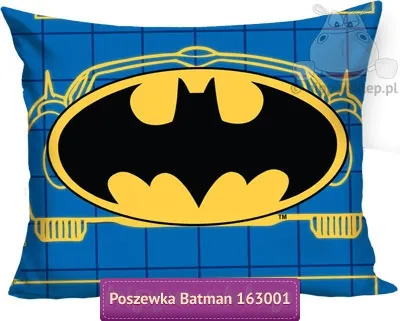 Duża poszewka Batman ze znakiem rozpoznawczym człowieka nietoperza najbardziej znanego dziecięcego superbohatera. Duża poszewka Batman 70x80 lub 50x80 cm w kolorze niebieskim z żółto-czarnym logo oraz żółtym zarysem Batmobila pojazdu Batmana. Duże poszewki z logo Batmana mogą służyć wraz z wypełnieniem jako dodatkowe lub rezerwowe poduszki do kompletów pościeli. Duża niebieska poszewka z Batmanem zapinana na suwak, na licencji DC Comics wyprodukowana ze 100% bawełny, posiada certyfikat Oeko-Tex 100. Duże poszewki z Batmanem to doskonały pomysł uzupełnienie kompletów pościelowych. Producent poszewki Carbotex, model Poszewka Batman BAT 163001, ean 2345678001002
