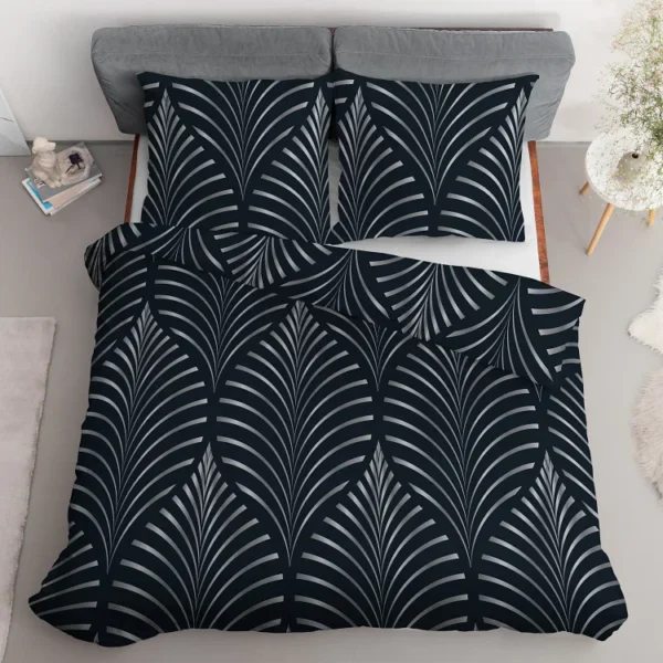 Elegancki komplet pościeli przeznaczony dla dwóch osób z symetrycznym i powtarzanym wzorem łączący perfekcyjną geometrię stylu art deco z botanicznym motywem liści. Zestaw pościeli z satyny bawełnianej w głębokim odcieniu grafitu z srebrno-szarymi elementami ornamentu liści.