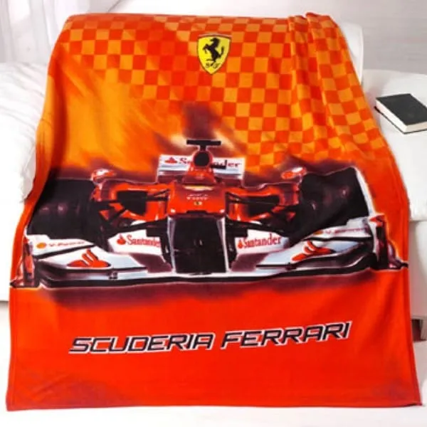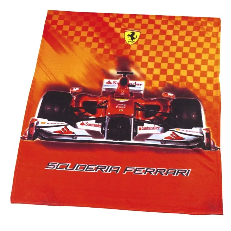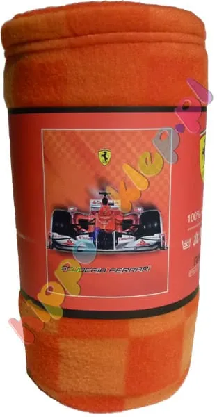 Koc polarowy Ferrari Scuderia F1 Team oryginalny licencyjny koc Ferrari Scuderia F1 Team. Starannie wykonany kocyk w rozmiarze 130x170 cm, posiada certyfikat OEKO-TEX standard 100 potwierdzający wykonanie z materiałów najwyższej jakości. Niezbędny na plaży i pikniku niezastąpiony w domu doskonały pomysł na prezent dla każdego małego fana wyścigów Formuły 1.