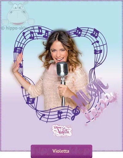 Koc polarowy Violetta kolorowy kocyk dla dziewczynek z postacią śpiewającej bohaterki serialu wyświetlanego na kanale Disney Channel. Miękki, ciepły i lekki koc z Violettą niezastąpiony na pikniku i nad wodą i na plaży. Rewelacyjny koc polarowy w rozmiarze 110x140 cm, starannie wykończony, w praktycznym opakowaniu i rozsądnej cenie może być ciekawym pomysłem na prezent dla wielbicielek Tini Stoessel na każdą okazję.