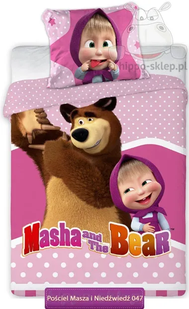 Mała pościel do łóżeczka Masza i Niedźwiedź dla dziewczynki. Pościel dla maluchów z bohaterami serialu animowanego dla najmłodszych Masza i Niedźwiedź o wesołych przygodach małej psotnej dziewczynki o imieniu Masza oraz niedźwiedzia cyrkowego. Pościel niemowlęca z Maszą i misiem cyrkowym w różowej kolorystyce w białe groszki z postaciami pary bohaterów na poszwie oraz wesołej Maszy na powłoczce na poduszkę. Komplet pościeli do łóżeczka z Maszą i Niedźwiedziem 100x135, 90x130 lub 90x120 cm zależności od wybranej opcji rozmiaru z jedną powłoczką na małą płaską poduszkę 40x60 cm w komplecie. Bawełniane pościele z Masza i Niedźwiedziem zapinane na wygodny suwak, wykonane ze 100% bawełny z certyfikatem Oeko-Tex standard 100, przebadane i bezpieczne dla dzieci. Pościel do łóżeczka wykonana na licencji Animacord, z oficjalnej kolekcji, producent Faro, model Pościel do łóżeczka Masza i Niedźwiedź 047, ean 5907750585793 (100/135)