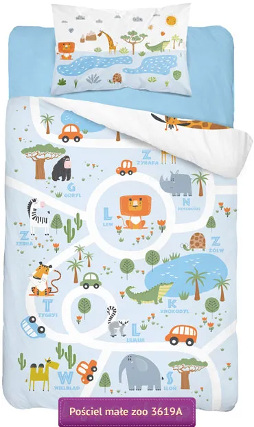 Komplet pościeli bawełnianej dla maluchów ze zwierzątkami z małego zoo. Komplet pościeli z postaciami zwierzątek z zoo: słonia, wielbłąda, lemura, tygrysa, krokodyla, żółwia, hipopotama, nosorożca, żyrafy, goryla, zebry i kameleona. Dwustronne pościele z motywem egzotycznych zwierzątek w niebiesko-białej kolorystyce z rewersem w postaci metryczki - tła do wykonywania zdjęć kolejnych dni, tygodni i miesięcy życia malucha. Dwustronna powłoczka na poduszkę z motywem zwierzątek w zoo po jednej stronie oraz napisem „moi najlepsi przyjaciele” na rewersie. Komplety pościeli mini zoo przeznaczone do łóżeczek o wielkości materaca 60x120 lub 70x140 cm, wykonane ze 100% bawełny pościelowej, gładkiej, poszwa na kołdrę i poszewka na poduszkę zasuwana na zamek. Zestawy pościeli Mayamoo do łóżeczka z motywem mini zoo o wymiarach poszwy na kołderkę 100x135, 90x120, 90x130 cm z jedną powłoczką na poduszkę 40x60 cm w zależności od wybranej opcji rozmiaru. Komplety pościeli z małym zoo to świetne uzupełnienie pokoików najmłodszych dzieci urządzonych w delikatnych pastelowych barwach i odcieniach. Producent Detexpol, model Pościel niemowlęca ze zwierzątkami - małe zoo 3619A, ean 5901685669535 (90/120), 5901685669542 (100/135)