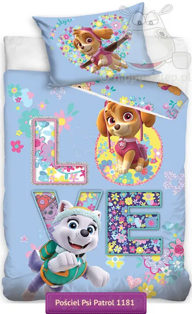 Pościel Psi patrol dla dziewczynek z postaciami młodych szczeniaków z bohaterskiej drużyny Psiego Patrolu. Bladoniebieska pościel dla dziewczynek Psi patrol z pieskami Skye i Everest na tle napisu LOVE. Rewers pościeli w tym samym kolorze i drobnymi motywami nawiązującymi do postaci z animacji. Pościel Psi patrol 90x120, 90x130 lub 100x135 z jedną powłoczką 40x60 cm w komplecie z takim samym motywem po obu stronach. Bawełniana, mała pościel dziecięca Psi Patrol dla dziewczynki do łóżeczka lub małego łóżka dziecięcego, ze 100% bawełny z atestem Oeko-tex standard 100 Tekstylia godne zaufania, zapinana na suwaki. Oryginalna pościel z motywem Paw Patrol dla dzieci, na licencji Spin Master / Nickelodeon. Producent: pościele Paw Patrol Carbotex, model Mała pościel dziecięca Psi Patrol PAW 181181, ean 5902689430954
