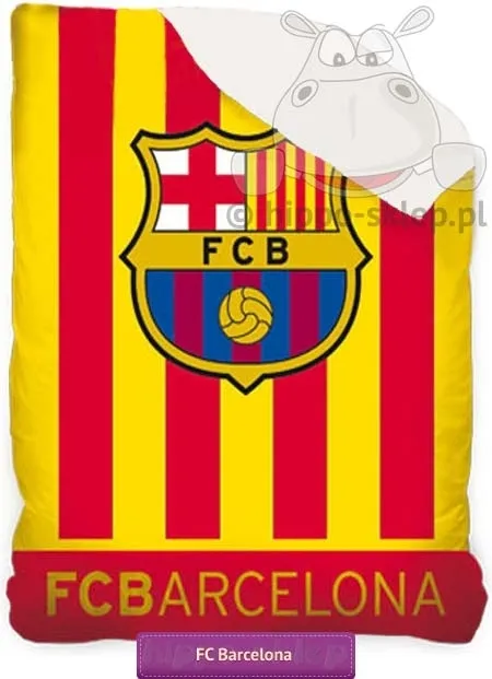 Narzuta FC Barcelona dla kibica i fana hiszpańskiego klubu ze stolicy Katalonii w żółto czerwone pionowe pasy nawiązujące do barw Katalonii. Narzuta FC Barcelona z herbem klubu na tle narodowych żółto czerwonych barw Katalonii, pikowana, w rozmiarze 140x200 cm, poszycie wierzchnie 100% bawełna, spód wykonany z mikrowłókna poliestrowego. Narzuty FC Barcelona w rozmiarze 140x195 cm doskonale sprawdzą się jako nakrycie na łóżko z materacem wielkości w zakresie 90x180 cm a 140x190 cm w każdym pokoju lub sypialni gdzie piłka nożna jest najważniejszym sportem. Narzuta dla dzieci FC Barcelona na jednoosobowe łóżko dziecięce to świetny pomysł na urozmaicenie wystroju pokoju małego piłkarza i fana Barcy oraz doskonały pomysł na upominek na każdą okazję. Model Narzuta FC Barcelona 04, ean 2345678000012