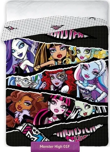 Narzuta dziecięca Monster High 02 narzuta dziecięca dla dziewczynek z postaciami Straszyciółek z filmu i serialu Monster High: Clawdeen Wolf, Draculaura, Frankie Stein, Abbey Bominable, Operetta, Ghoulia Yelps, Lagoona Blue, Cleo de Nile oraz Spectra Vondergeist. Narzuta z Monster High drobno pikowana, rozmiar 160x200 cm +/- 5%, poszycie 100% bawełna, wypełnienie 100% poliester, obszycie w kolorze poszycia spodniego narzuty, boki zaokrąglane. Narzuta dla dzieci w rozmiarze 160x200 cm doskonale sprawdzi się jako nakrycie na łóżka z materacami w przedziale pomiędzy 120x180 cm a 160x200 cm. Narzuta z Monster High to świetny pomysł na urozmaicenie wystroju pokoju dziewczynek i doskonały pomysł na upominek dla małych fanek laleczek i serialu Monster High. Producent Faro, model Narzuta Monster High 001 czarna