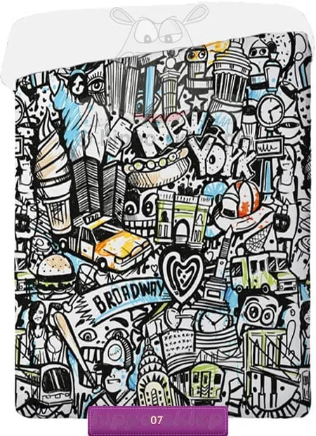 Narzuta New York graffiti – narzuta młodzieżowa z charakterystycznymi motywami - symbolami Nowego Yorku. Narzuta New York Graffiti pikowana, w rozmiarze 140x200 cm, poszycie wierzchnie 100% bawełna, spód wykonany z mikrowłókna poliestrowego. Narzuta New York graffiti w rozmiarze 140x200 cm doskonale sprawdzi się jako nakrycie na łóżka z materacami w przedziale pomiędzy 90x180 cm a 140x200 cm, to także świetny pomysł na urozmaicenie wystroju pokoju uwielbiających motywy Nowego Yorku i graffiti.
