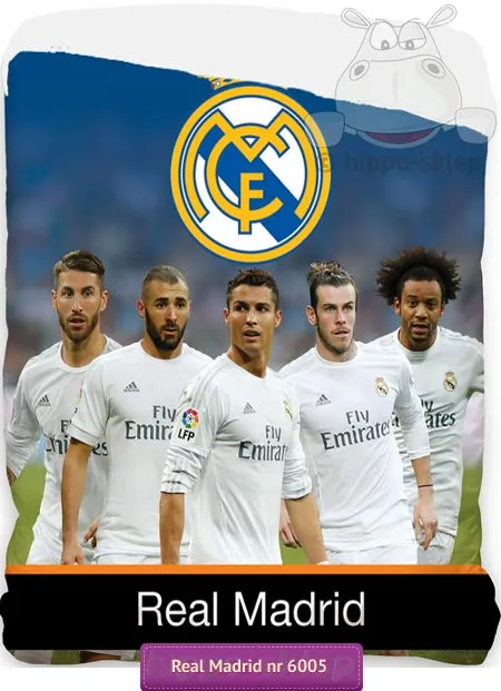 Narzuta z wizerunkami piłkarzy Realu Madryt w tym jednego z największych wirtuozów football-u Cristiano Ronaldo. Narzuta z piłkarzami Realu Madryt na łóżko jednoosobowe w błękitnej kolorystyce z dużym Herbem drużyny oraz postaciami piłkarzy Królewskich z Madrytu: Cristiano Ronaldo CR7, Gareth Bale, Karim Benzema, Sergio Ramos oraz Marcelo oraz napisem na czarnym tle Real Madrid. Narzuta, nakrycie na łóżko pojedyncze, o wymiarach 140x195 cm (+/- 3%), pikowana, z poszyciem wierzchnim ze 100% bawełny, spód wykonany z mikrowłókna poliestrowego w kolorze białym, które zapobiega przesuwaniu narzuty po materacu. Doskonały i praktyczny pomysł na zabezpieczenie materaca i pościeli w ciągu dnia dla wszystkich małych i większych fanów hiszpańskiej piłki i królewskich z Madrytu.