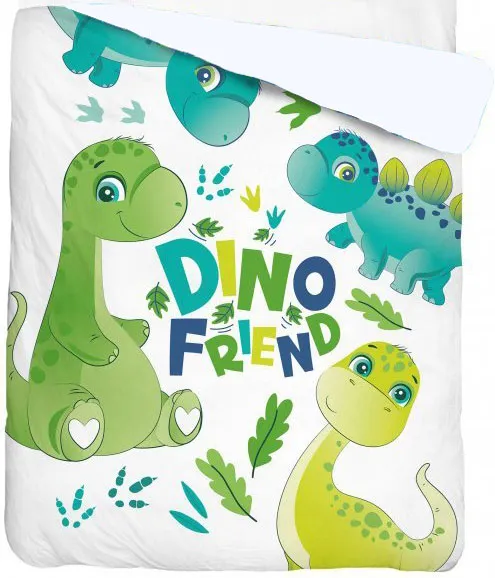 Narzuta w dinozaury na łóżko dziecięce dla chłopca. Szaro zielono-niebieska narzuta dla dzieci z motywem kolorowych dinozaurów o różnych wielkościach i kształtach oraz dużym napisem "Dino Friend" pośrodku. Narzuta dla młodszych dzieci z Dinozaurami zawiera elementy świecące w ciemności po wcześniejszej ekspozycji na światło w postaci obwódek kształtów Dinozaurów oraz napisu Dino Friend. Kapa - nakrycie na łóżko dla chłopców z elementami świecącymi w nocy, rewers w kolorze białym wykonany z mikrofibry zapobiegającej zsuwaniu narzuty z materaca. Narzuta dekoracyjna w Dinozaury 140x195 cm (+/- 3%), pikowana, z poszyciem wierzchnim ze 100% bawełny przeznaczona na łóżko dziecięce z materacem o wielkości od 80x160 cm do 120x195 cm. Narzuta ze świecącym motywem wesołych dinozaurów doskonale sprawdzi się w tematycznym pokoju chłopca z Dinozaurami lub w stylu prehistorycznym, lub w pokoju urządzonym w biało zielonej kolorystyce. Wyjątkowa narzuta na łóżko z Dinozaurami świecąca w nocy po uprzedniej ekspozycji na światło słoneczne lub sztuczne. Na zdjęciach w ciemnej kolorystyce pokazują elementy świecące w ciemności. Model Narzuta w dinozaury świecąca w ciemności Dino 002