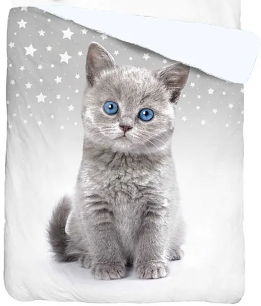 Świecąca w ciemności narzuta z przepięknym szarym kotkiem. Nakrycie na łóżko dziecięce z nadrukiem dużego szarego kotka oraz elementami świecącymi w nocy lub w ciemności w postaci fragmentów sierści kota i motywami gwiazdek. Narzuta na średnie łóżka dziecięce o wymiarach materaca od 80x160 cm do 120x190 cm z elementami świecącymi w ciemności po wcześniejszej ekspozycji na światło (elementy nadruku oddające światło w ciemności pokazane są w neonowym żółtym kolorze na ciemniejszym zdjęciu narzuty). Świecąca w ciemności narzuta z kotkiem w rozmiarze 140x195 cm (+/- 3%), pikowana, z poszyciem zewnętrznym ze 100% bawełny, poszycie spodu z mikrowłókna poliestrowego o strukturze przeciwdziałającej zsuwaniu się narzuty z materaca. Fluorescencyjna narzuta z kotkiem to także świetny pomysł na uzupełnienie wystroju pokoju małego wielbiciela kotków. Model Świecąca w ciemności narzuta z kotkiem 4545
