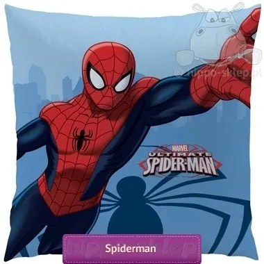 Poduszka dla dzieci Spider-man z wizerunkiem superbohatera człowieka Pająka znanego również jako Petera Parkera niepozornego mieszkańca Nowego Yorku. Poduszka dwustronna z postacią Spidermana na niebieskim tle po jednej stronie oraz fragmentem maski spider-mana w kolorze czerwonym na odwrocie. Poduszka dekoracyjna z nadrukiem w rozmiarze 40x40 cm z wypełnieniem z poliestru oraz poszyciem z mikrofazy z wyraźnym nadrukiem po obu stronach. Poliestrowe poduszki ze Spidermanem na licencji Marvel Studios (Disney). Producent poduszek CTI, kod EAN 3272760436697, model 43669 Spiderman Spider
