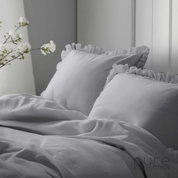 Zestaw jednokolorowej pościeli z delikatnymi falbankami w subtelnych pastelowych odcieniach neutralnych barw z kolekcji Pure. Pastelowy popiel, jasny, subtelny odcień szarości, współgra z minimalistycznymi wnętrzami w stylu skandynawskim, świetnie łącząc się z bielą, pastelami czy naturalnym drewnem. Stonowana barwa sprzyja wyciszeniu i relaksowi po całym dniu. Delikatne falbanki na obrzeżach poszwy na kołdrę i powłoczek na poduszki dodają wyrafinowanego wyglądu, sprawiając, że sypialnia staje się bardziej stylowa i przytulna.