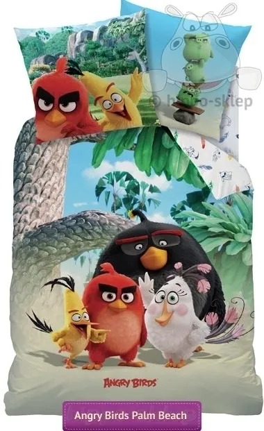 Pościel Angry Birds movie z najnowszej pełnometrażowej produkcji Rovio opowiadającej o szczęśliwym życiu ptaków nielotów na egzotycznej wyspie do czasu pojawienia się statku ze świniami. Pościel dziecięca Angry Birds movie z bohaterami filmu Red-em, Chuck-iem, Bomb-em i Matyldą oraz świnkami w rozmiarach 140x200 cm lub 135x200 cm w zależności od wybranego wariantu rozmiaru z jedną powłoczką 70x80 cm. Bawełniana pościel z postaciami filmowej przygód wściekłych ptaków to doskonały pomysł na upominek dla fanów gier zręcznościowych Rovio. Producent - Pościel CTI, model 44060 Angry Birds Palm Beach, ean 3272760440601