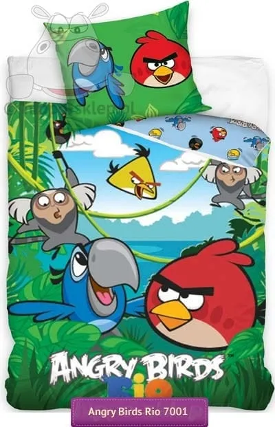 Pościel Angry Birds Rio Amazonia dla chłopców lub dziewczynek dostępna w wariantach rozmiaru na kołdrę 140x200 cm, 150x200 cm lub 160x200 cm w zależności od wybranej opcji oraz poszewki na poduszkę 70x80 cm. Pościel z Blu - papugi z filmu Rio 2 oraz Redem z postacią najważniejszego ptaka z serii gier Rovio bohaterami gry Angry birds Rio 2. Pościel w odcieniach zielonego przedstawiająca lasy Amazońskie z postaciami Blue i Red -a oraz małpkami które w tej edycji zastąpiły tradycyjne świnki. Pościel dla dzieci Angry Birds Rio Amazonia wykonana z bawełny 100% zapinane na suwaki, posiada certyfikat tekstylia godne zaufania OEKO-TEX 100. Świetny pomysł na praktyczny prezent dla maluchów. Producent Pościel Carbotex, model Pościel Angry Birds AB 7001