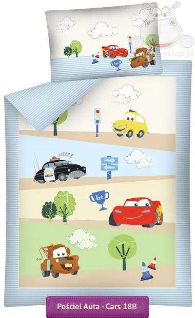 Pościel Auta Zygzak i Złomek dla malucha i niemowlaka z postaciami przyjaciół z Chłodnicy Górskiej Zygzaka McQueena oraz Złomka a także Luigi i Szeryfem bohaterami filmu Disney-a Auta. Dwuczęściowa pościel dla niemowlaków w niebiesko beżowej kolorystyce z postaciami bohaterów filmu oraz delikatnymi motywami związanymi z samochodami. Pościele do łóżeczka z Zygzakiem McQueenem i Złomkiem 90x120 lub 100x135 cm w zależności od wybranego wariantu rozmiaru z jedną poszewką o wymiarze 40x60 cm w komplecie. Pościel do łóżeczka z Autkami dla chłopców, na licencji Disney Cars, ze 100 % bawełny, poszwa i poszewka zapinane na suwaki, w delikatnych niebiesko-beżowych odcieniach. Pościel dla niemowlaków Auta posiada certyfikat Oeko-Tex 100 potwierdzający wykonanie z bezpiecznych dla skóry dziecka surowców oraz pozytywną opinię Instytutu Matki i Dziecka w Łodzi. Doskonały i praktyczny upominek dla każdego małego brzdąca uwielbiającego samochodziki. Producent Pościel Detexpol, model Mała pościel Auta Cars 18B DC, ean 5901685617581