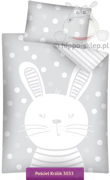 Niemowlęca pościel bambusowa z króliczkiem do łóżeczek dziecięcych. Komplet pościeli dla niemowlaka z lekkiej, ekologicznej tkaniny bambusowo-bawełnianej (50% bambus + 50% bawełna) w modnej szarej kolorystyce. Szara, dwustronna pościel w grochy ze śpiącym królikiem po jednej stronie oraz w poziome paseczki z napisem "Mały króliczek" (Little Bunny) na odwrocie. Dwustronna powłoczka na poduszkę w grochy po jednej stronie oraz z postacią króliczka na odwrocie. Pościel z króliczkiem z bezpiecznej tkaniny bawełniano-bambusowej certyfikowanej według Oeko-Tex standard 100 Tekstylia Godne Zaufania. Rewers pościeli bambusowej w paseczki z napisem może też pełnić funkcje tła do zdjęć dziecka z okresu niemowlęcego. Bambusowe pościele z królikiem w rozmiarach 80x120, 90x120, 90x130 lub 100x135 cm w zależności od wybranego wariantu wymiaru kompletu z zestawie z jedną powłoczką na poduszkę 40x60 cm. Uniwersalna i delikatna szara kolorystyka pościeli doskonale uzupełni wnętrze w niemal każdym odcieniu. Producent pościeli Detexpol, model Dwustronna pościel bambusowa z królikiem Mayamoo 3033, ean 5901685645386 (90/120) 5901685645393 (100/135)
