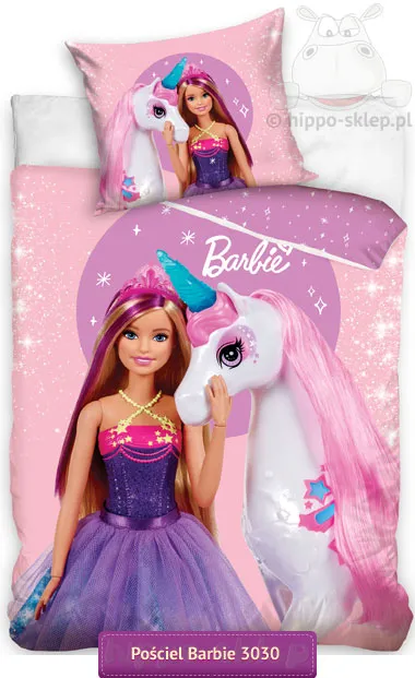 Pościel dla dziewczynki z postacią Barbi z jednorożcem. Licencyjny komplet pościeli firmy Mattel z lalką Barbie w fioletowej sukience oraz białym jednorożcem o różowej grzywie i niebieskim rogu. Bawełniana pościel z Barbi z postacią bohaterki filmów i seriali z laką wcielającą się w role postaci bajkowych i baśniowych oraz mitycznej postaci jednorożca. Bawełniany 2-częściowy komplet pościeli Barbi z jednorożcem 140x200, 160x200 a także 140x180, 135x200 lub 150x200 cm z jedna poszewką na poduszkę 70x80, 50x80 lub 50x60 cm w zależności od wybranej opcji rozmiaru. Pościel Unicorn i lalka Barbie w różowej kolorystyce z drobnymi elementami w postaci gwiazdek i białym napisem. Rewers pościeli w delikatnym kolorze fioletowym z motywem gwiazdek. Bawełniane pościele z laką Barbi i jednorożcem wykonane ze 100% bawełny gładkiej, certyfikowane według Oeko-Tex standard 100, poszwa i powłoczka zapinane na suwak. Pościel Barbie z motywem jednorożca to świetne urozmaicenie pokoju lub sypialni małej fanki serialu i filmów oraz uwielbiającej zabawy lalkami. Producent Carbotex, model Pościel Barbie unicorn BARB213030, ean 5902689494840 (140/200), 5902689494833 (160/200)