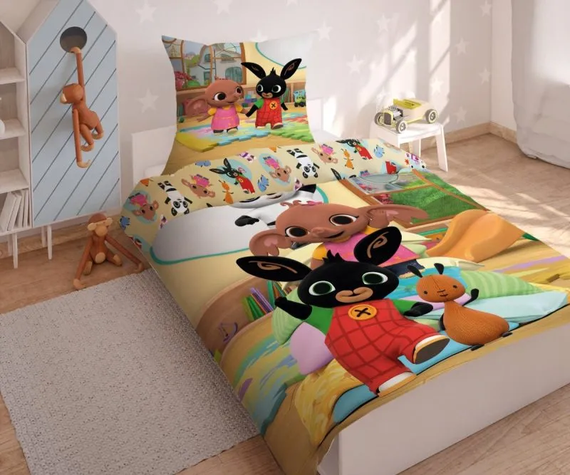 Pościel Bing z bohaterami serialu dla dzieci o przygodach małego króliczka. Bawełniany komplet pościeli z Bingiem dla dzieci w wieku przedszkolnym z postaciami królika, Pando, Flopa oraz Sula. Pościel Bing w żółto-beżowej kolorystyce z postaciami z serialu dla najmłodszych na poszwie oraz królikiem Bingiem i jego najlepszą przyjaciółką Sulą na poszewce na poduszkę. Rewers pościeli w beżowo-żółtej kolorystyce z drobnymi motywami postaci z serialu. Bawełniana pościel Bing 140x200, 135x200, 140x180 lub 140x160 cm oraz pościele Bing 100x160, 120x160, 120x180, 140x160 lub 140x180 cm dla najmłodszych w komplecie z jedną poszewką na poduszkę 70x80, 60x70, 50x80, 50x75, 50x70 lub 50x60 cm w zależności od wybranego wariantu rozmiaru. Licencyjne komplety pościeli (poszwa na kołdrę i powłoczka na poduszkę) z motywem Binga wykonane ze 100% bawełny, z atestem Oeko-Tex 100, zapinana na suwaki. Producent Detexpol, model Pościel królik Bing 02 - 051, ean 5901685658898 (140/200), 5407007987320 (160/200)