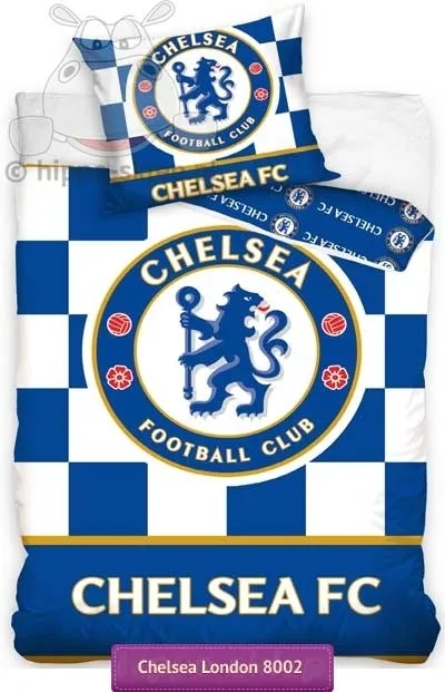 Pościel Chelsea Londyn w rozmiarach 140x200 i 135x200 z logo klubu na błękitno białej szachownicy w tle. Zestaw pościeli z Chelsea Londyn dla młodzieży kibiców, piłkarzy i fanów Brytyjskiej drużyny. Pościele Chelsea Londyn z jedną poszewką na poduszkę 70x80 cm i poszwą na kołdrę w rozmiarach 135x200, 140x200 cm w zależności od wybranej opcji rozmiaru. Pościel piłkarska wykonana ze 100% bawełny gładkiej, zapinana na suwaki, certyfikowana według Oeko-Tex standard 100 co gwarantuje wykonanie z materiałów bezpiecznych dermatologicznie. Oryginalna pościel na licencji w barwach i z logo Chelsea z oficjalnej kolekcji klubowej, z hologramem. Producent Carbotex, model Pościel piłkarska Chelsea CFC 8002, ean 5902022941550