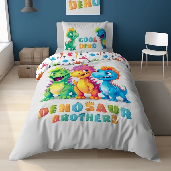 Kolorowy komplet pościeli świecącej z postaciami uśmiechniętych dinozaurów 4761, 100% bawełna, na suwaki, rozmiary 160/200, 150/200, 140/200, 135/200, 140/180, 140/160, 120/160, 120/180 cm.