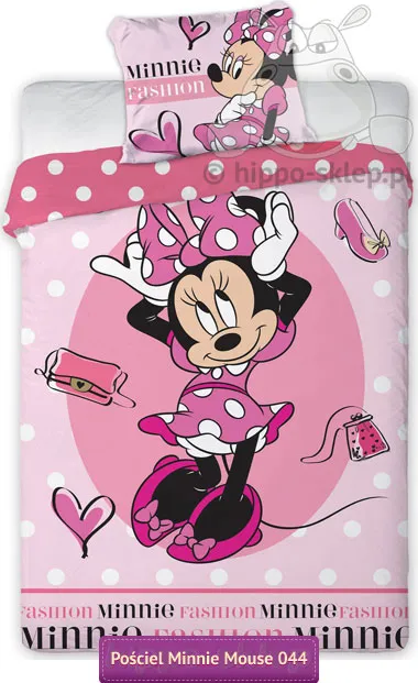 Pościel Disney Minnie Mouse, dziecięcy komplet pościeli z wizerunkiem najsłodszego na świecie bohatera animacji i kreskówek dla dziewczynek. Pościel Disney Minnie Mouse z wizerunkiem uroczej Minie ubranej w sukienkę w grochy z charakterystyczną kokardą na głowie oraz pantofelkami. Komplet pościeli Disney Minnie Mouse w kolorystyce delikatnego różu z motywami białych groszków oraz napisami "Minnie Fashion", oraz dużą postacią Myszki Minnie zarówno na poszwie jak i na powłoczce. Pościel Disney Minnie Mouse 140x200, 160x200 cm oraz 135x200 lub 150x200 z powłoczką na poduszkę 70x80 cm, lub 50x80 cm w zależności od wybranej opcji. Pościele Disney z Minnie Mouse wykonane na licencji Disneya, ze 100% bawełny gładkiej, certyfikat Oeko-Tex standard 100, zapinana na suwaki bez wodzików. Pościel Minnie Mouse Disneya doskonałe uzupełnienie wnętrza dziecięcej sypialni lub pokoju w urządzonego w stylu Myszki Minnie z przewagą jasnych odcieni różowego, lub w kolorze białym z różowymi akcentami. Producent Pościel Faro, model Pościel dla dzieci Myszka Minnie 044, ean 5907750578887 (160/200)