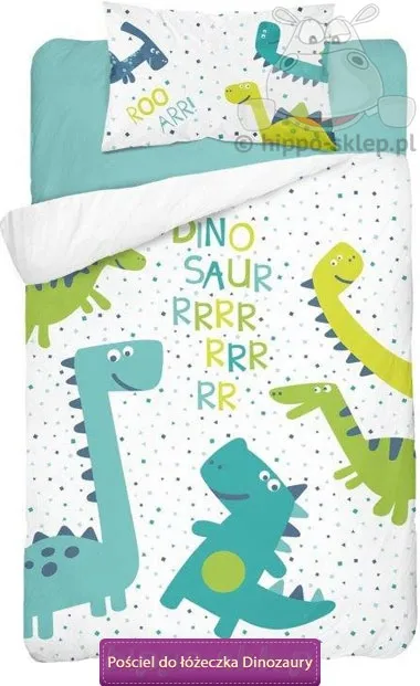 Mała pościel do łóżeczka w Dinozaury dla chłopców i dziewczynek. Bawełniany komplet pościeli w dinozaury do łóżeczek dziecięcych z wizerunkiem uśmiechniętych dinozaurów. Biała pościel dla niemowlaków i dzieci we wczesnym wieku przedszkolnym z zielonymi dinozaurami w kolorowe kropki w różnych odcieniach zieleni oraz dużym napisem Dinosaurrrrrr po środku. Dziecięca pościel do łóżeczka z dinozaurami wykonana ze 100% bawełny z atestem Oeko-Tex standard 100 oraz z pozytywną opinią IMiD w Łodzi, poszwa i poszewka zapinana na suwaki. Mała pościel w Dinozaury 135x100, 130x90 lub 120x90 cm, w zależności od wybranej opcji wymiaru poszwy z jedną powłoczką 40x60 cm w komplecie. Pościel dla maluchów i przedszkolaków w dinozaury w pastelowych odcieniach zieleni świetnie sprawdzi się w pokojach i sypialniach dziecięcych urządzonych w stylu Dinozaurów z dodatkiem lub akcentami koloru zielonego. Rewers pościeli sprawdzi się doskonale jako przepiękne tło do zdjęć z okresu niemowlęcego dokumentujących pierwsze aktywności dziecka. Producent pościele Detexpol, model Mała pościel do łóżeczka z dinozaurami 3148 A, ean 5901685649940
