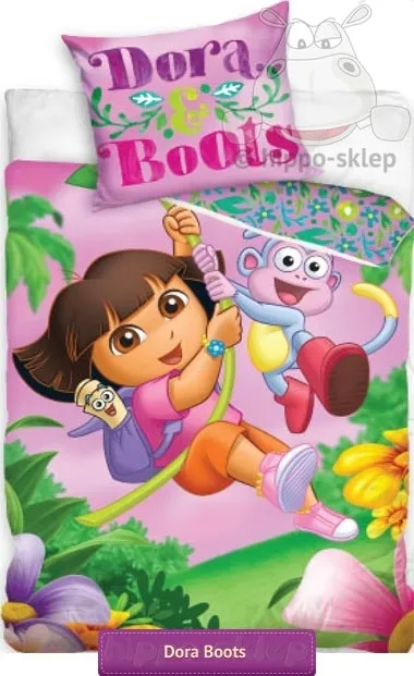 Pościel Dora z bohaterką serialu edukacyjnego dla dzieci Dora poznaje świat, wyświetlanego na kanale Nickelodeon o przygodach małej 7-letniej dziewczynki o imieniu Dora oraz jej nieodłącznego przyjaciela, małpki o imieniu Butek. Pościel z Dorą huśtająca się wraz z Butkiem na lianie, w fioletowo-różowej kolorystyce i napisami Dora oraz Boots na powłoczce. Pościel Dora z postaciami bohaterów o wymiarach 140x200 cm lub 135x200 cm, a także 160x200 lub 150x200 w zależności od wybranej opcji i jednej, lub dwóch powłoczek w rozm. 70x80 cm. Komplet pościeli Dora The Explorer zapinany na suwaki, wykonany na licencji Nickelodeon, ze 100% bawełny gładkiej, posiada certyfikat Tekstylia Godne Zaufania Oeko-Tex standard 100 potwierdzający wykonanie z materiałów bezpiecznych dla skóry dziecka. Doskonały pomysł na upominek dla najmłodszych wielbicieli serialu dla przedszkolaków. Producent Carbotex, model Pościel dla dzieci Dora poznaje Świat DOR 163001, ean 5902385212830 (160/200). Uwaga! Sprzedaż w promocyjnej, obniżonej cenie. Wyjątkowa cena pościeli na licencji do wyczerpania zapasów.