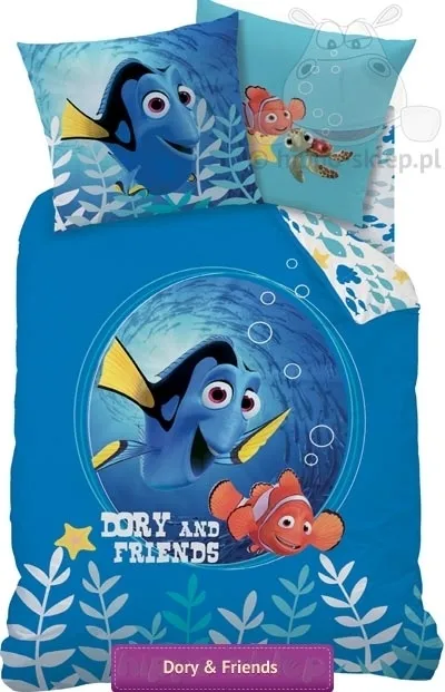 Pościel Dory i Nemo filmu Disney-a z postacią rybki Dori przyjaciółki Nemo której pamięć płata wyjątkowe figle. Komplet pościel z rybkami Nemo i Dory z filmu Gdzie jest Dory (Finding Dory) wykonana na licencji Disney Pixar z oficjalnej kolekcji. Pościel z rybkami Dory i Nemo w kolorze niebieskim z postaciami zapominalskiej Dory i małego błazenka Nemo. Rewers pościeli w kolorze białym z drobnymi motywami kolorowych rybek, powłoczka na poduszkę dwustronna z dużą postacią Dory po jednej i Nemo z żółwikiem Luzakiem na rewersie. Pościel z Dory i Nemo 140x200 cm lub 135x200 cm w zależności od wybranej opcji z jedną powłoczką 70x80 cm w komplecie. Dostępna również pościel z Nemo i Dory 100x160, 120x160, 140x160 a także 140x180 cm z poszewką 50x80 lub 50x60 cm w zestawie. Komplety pościeli z rybkami Disney-a ze 100% bawełny gładkiej, zapinana na wygodne suwaki, posiada certyfikat Tekstylia godne Zaufania Oeko-Tex standard 100 potwierdzającym jej wykonanie z bezpiecznych materiałów. Komplet pościeli dziecięcej z Dory to fantastyczny upominek dla fanów filmu o przygodach pragnącego poznać świat Nemo oraz jej przyjaciółki zapominalskiej Dory. Komplet pościeli w błękitnej kolorystyce doskonale pasuje do sypialni i pokoi dziecięcych urządzonych w niebieskiej kolorystyce o tematyce morskiej lub motywami rybek. Producent CTI, model Pościel Dory i Nemo 43632 43632, ean 3272760436321 Tania pościel dla dzieci z rybka Dory. Tylko u nas - najlepsze ceny najwyższej jakości markowej pościeli dziecięcej.