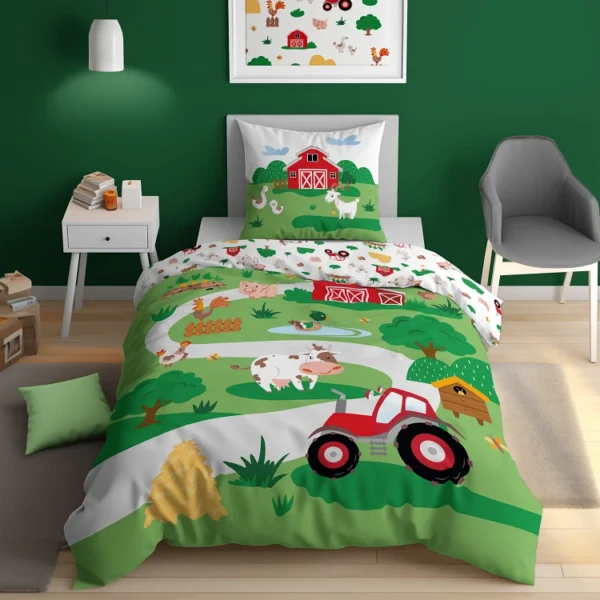 Poszwa na kołdrę i poszewka na poduszkę w żywej zielonej kolorystyce, z zabudowaniami zagrody, rabatkami, drzewami i krzewami, czerwonym traktorem, postaciami krówki, kurki oraz kogucika, a także kaczuszki i świnki. Rewers pościeli w kolorze białym z drobnym wzorem motywów zwierzątek i zabudowań farmy.
