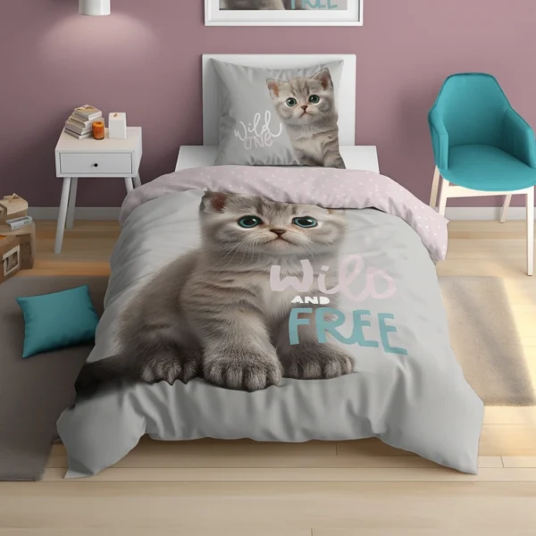 Pościel fluorescencyjna z kotem. Delikatny, różowo-szary wzór pościeli z kotkiem o zielonych oczach z napisem Wild and free na poszwie. Fluorescencyjna pościel z małym kotem oddająca światło w ciemności w postaci zarysu sierści kotka i napisu. Elementy oddające światło są pokazane na ciemnoniebieskim zdjęciu w neonowym żółtym kolorze. Rewers poszwy w kolorze różowym z białymi elementami. Pościel fluorescencyjna z kotkiem o wymiarach poszwy na kołdrę 140x200 lub 135x200 cm, a także mniejsze rozmiary 140x160 lub 140x180 w zależności od wybranego wariantu z jedną powłoczką na poduszkę 70x80, 60x70, 50x80, 50x75, 50x70 lub 50x60 cm w komplecie, zapinana na suwak. Efekt świecenia w ciemności można uzyskać po wcześniejszej ekspozycji na światło naturalne lub sztuczne. Dwustronna, świecąca w ciemności pościel z kotem, wyprodukowana z materiałów bezpiecznych dla dzieci - 100% bawełny, certyfikowana według Oeko-Tex standard 100, Tekstylia Godne Zaufania. Producent Detexpol, ean 5904708921993 (160/200), 5904708921900 (140/200), model Komplet pościeli świecącej z kotkiem 4757