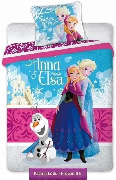 Pościel Frozen z filmu Kraina Lodu z postaciami Anny, Elsy i śmiesznego bałwana Olafa z ekranizacji Disney -a jednej z baśni Andersena - Królowa Śniegu. Pościel dla dziewczynek z bohaterkami filmu Frozen Kraina Lodu w dwóch wariantach: poszwa na kołdrę 140x200 cm albo 160x200 cm a także 135x200 lub 150x200 cm i jedna poszewka na poduszkę 70x80 cm, poszewka na kołdrę i poduszkę zapinana na suwaki. Pościel Frozen, 100% bawełna, wyprodukowana na licencji Disney, posiada certyfikat Oeko-Tex 100 gwarantujący wykonanie wyłącznie z surowców bezpiecznych dla skóry. Idealny prezent dla dziewczynek uwielbiających postacie Elsy posiadającej magiczną moc śniegu i lodu oraz jej trochę lekkomyślnej młodszej siostry Anny i bałwana Olafa. Producent pościel Faro, model Pościel dziecięca Frozen 01, ean 5907750530229 (160/200)