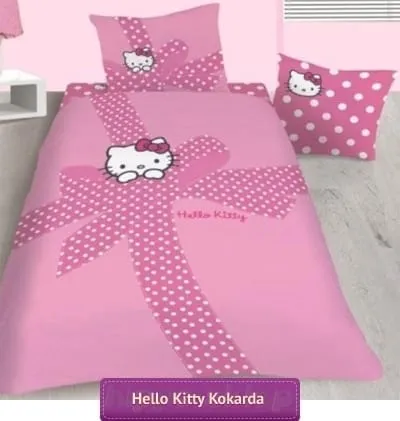Pościel Hello Kitty z kokardą dla dziewczynki z postacią najbardziej znanej na świecie kotki rasy bobtail mieszkającej w Londynie. Pościel dla dzieci z bohaterką filmów animowanych Hello Kitty Paradise oraz Przygody Kotki Kity niezmiennie popularnych wśród japońskich dzieci. Pościel dziecięca z Hello Kitty w kolorze delikatnego różu z motywem przewiązanych wstążką niczym prezent powłoczek oraz buzią kotki. Spodnia strona w kolorze jasno różowym z białymi kropkami czyli klasyczna "polka dot". Pościel Hello Kitty 100x160 oraz 120x160 cm w zależności od wybranej opcji z jedną powłoczką 40x60 lub 50x60 w komplecie, zapinana na guziki. Pościel Hello Kitty plumetis dla dziewczynek i nastolatek, wyprodukowana na licencji Sanrio. Pościel bawełniana Hello Kity wykonana z gładkiej i przyjemnej w dotyku 100% bawełny spełnia wymogi Oeko-Tex standard 100, który to certyfikat gwarantuje wykonanie z materiałów bezpiecznych dla dzieci. Czy pościel z kokardą może być ciekawym pomysłem na prezent - oceńcie sami. Producent pościel CTI, model Pościel dla dzieci Hello Kitty plumetis 39252, ean 3272760392528 Ostatnie sztuki, przecena do wyczerpania zapasów. Najtańsza francuska pościel dla dzieci.