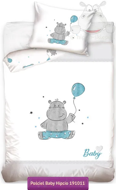 Mała pościel niemowlęca z uśmiechniętym hipciem trzymającym w ręce niebieski balonik. Pościel hipcio z niebieskim balonikiem ze 100% bawełny w biało-szarej kolorystyce z niebieskim akcentem, z dużą postacią siedzącego hipopotama na poszwie i powłoczce na poduszkę. Rewers pościeli z drobnymi postaciami małego hipopotama. Delikatna pościel do łóżeczka dziecięcego dla chłopca, przeznaczona do pokoi dziecięcych z jasnej kolorystyce z elementami w pastelowych odcieniach niebieskiego. Mała pościel hipcio z niebieskim balonikiem 90x120 lub 100x135 cm (dwa najpopularniejsze rozmiary) oraz pościel z hipciem 80x120 lub 90x130 cm w zależności od wybranego wariantu z jedną powłoczką na poduszkę 40x60 cm w komplecie, poszwa i poszewka zapinane na suwaki. Subtelny wzór pościeli do łóżeczka dziecięcego malucha ze 100% bawełny pościelowej gładkiej, z atestem Oeko-Tex standard 100. Producent pościele do łóżeczka Carbotex, model Mała pościel hipcio z niebieskim balonikiem 191011, ean 5902689436215 (100/135)