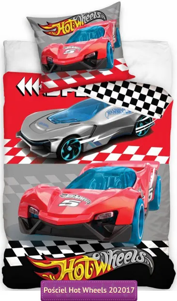 Pościel Hot Wheels na licencji Mattel dla chłopców. Pościele z resorakami Hot Wheels dla małych pasjonatów zabawy samochodami na torach wyścigowych w czerwono-szaro czarnej kolorystyce z pędzącymi samochodami oraz logo Hot Wheels z elementami flagi w szachownicę symbolizującej zakończenie wyścigu (na rewersie). Bawełniana pościel z resorakami Hot Wheels 140x200 cm, 150x200 cm, 160x200 cm lub 135x200 cm w zależności od wybranej opcji z powłoczką 70x80 cm w komplecie. Pościel z replikami samochodów wyścigowych wyprodukowana na licencji Mattel, ze 100% bawełny, atestowana zgodnie z Oeko-Tex standard 100 z materiałów bezpiecznych dla dzieci. Uniwersalna pościel z Hot Wheels Mattel dla wszystkich chłopców uwielbiających samochody i zabawy samochodami w każdej postaci. Genialny i praktyczny pomysł na zawsze trafiony prezent dla małego chłopca. Producent Carbotex, model Pościel Hot Wheels HW 202017, ean 5902689475283 (160/200)