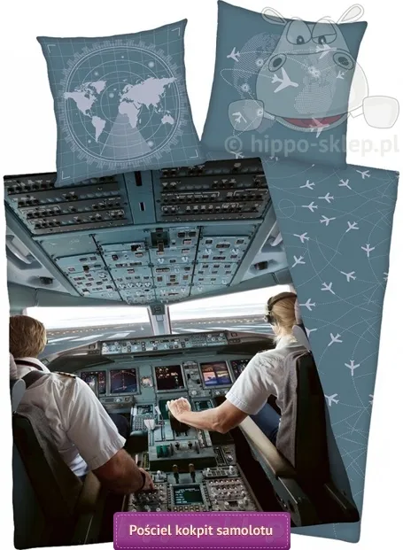 Bawełniany komplet pościeli kokpit samolotu przedstawiający wnętrze kabiny pilotów - kokpitu dużego samolotu podczas startu. Młodzieżowa pościel dla chłopców pasjonatów lotnictwa z motywem startującej załogi pilotów samolotu pasażerskiego w szaro niebieskiej kolorystyce. Rewers pościeli z motywami siatki połączeń i drobnymi ikonami samolotów, powłoczka na poduszkę przedstawia mapę świata zamkniętą w kształcie wskaźnika radarowego kontroli lotów. Bawełniana pościel kokpit samolotu 140x200 lub 135x200 cm z poszewką na poduszkę 70x80 cm w komplecie, poszwa i poszewka zapinana na suwak . Pościel kokpit - Young Collection, wykonana ze 100% bawełny gładkiej, posiada certyfikat Oeko-Tex standard 100 potwierdzający wykonanie z materiałów bezpiecznych dla dzieci i młodzieży. Producent: Herding (Niemcy), model Pościel młodzieżowa kokpit samolotu 4459239 077, ean 4006891915160 (140/200)