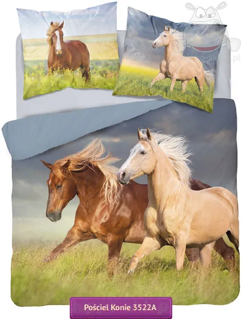 Bawełniana pościel konie w galopie to fantastyczna propozycja dla wszystkich kochających konie i wszystkiego, co z nimi związane. Przepiękna pościel z galopującą po łące parą koni rasy gniadej i jasnobułanej na tle szaro-niebieskiego nieba. W komplecie dwie powłoczki na poduszki z końmi w statycznych ujęciach po obu stronach. Rewers pościeli w jednolitej niebiesko-szarej kolorystyce. Bawełniana pościel konie w galopie, przeznaczona dla dzieci, nastolatków oraz dorosłych kochające konie i sporty konne. Komplet bawełnianej pościeli konie w galopie o wymiarach poszwy na kołdrę 160x200, 180x200, 200x200 lub 200x220 cm z dwiema poszewkami na poduszki 70x80 cm w komplecie. Pościele z pięknymi końmi zapinane na suwaki, wyprodukowane ze 100 % bawełny gładkiej, certyfikowana zgodnie z Oeko-Tex 100 - Tekstylia Godne Zaufania. Ten zestaw pościeli to genialny pomysł na upominek dla wszystkich miłośników tych przepięknych zwierząt. Producent Detexpol, kolekcja Holland natura, model Pościel z parą koni w galopie 3522 A, ean 5901685665728 (160/200)