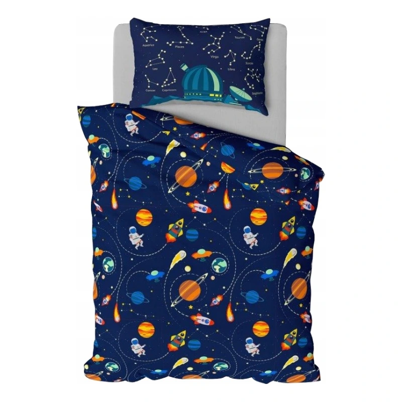 Granatowa pościel z motywami kosmicznymi Young-101, 100% bawełna, Oeko-Tex 100, zapinana na suwaki, wszystkie rozmiary dziecięce i młodzieżowe.