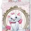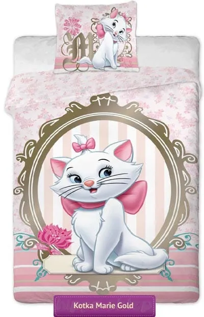 Pościel kotka Marie Cat 01 140x200 dla dziewczynki z postacią kotki Marie Cat z filmu Aryskotraci (Aristocats). Przepiękna pościel w delikatnych kolorach z tytuową Marie Cat - kotą o śnieżnobiałym futerku, na licencji Disney Marie Cat wykonana ze 100% bawełny gładkiej, poszwa na kołdrę w rozmiarze 135x200 lub 140x200 cm a poszewka na poduszkę 70x80. Poszwa na kołdrę i poszewka na poduszkę zapinana na suwak. Komplet pościeli dziecięcej z kotką Marie posiada certyfikat OEKO-TEX 100 gwarantujący jej wykonanie z materiałów bezpiecznych dla skóry dziecka. Świetny pomysł na praktyczny prezent dla dziewczynki.