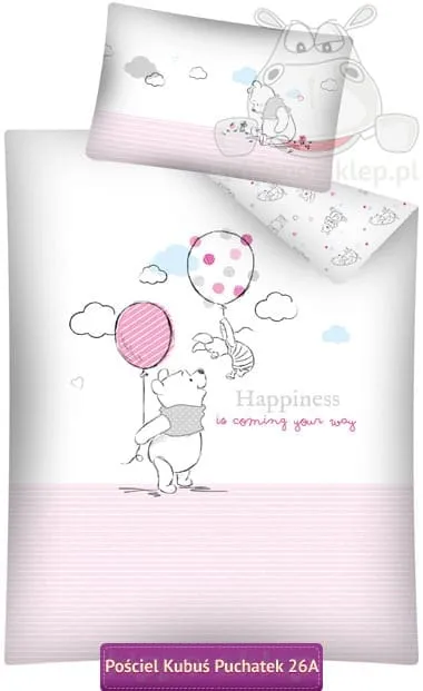 Mała pościel dziecięca Kubuś Puchatek balonik z postaciami bohaterów Disney-a Kubusiem Puchatkiem i Prosiaczkiem. Pościel bawełniana dla dzieci z Kubusiem Puchatkiem i jego przyjacielem prosiaczkiem w jasnej różowo białej kolorystyce. Komplet pościeli dla niemowlaków i maluchów z Puchatkiem wykonany na licencji Disney-a ze 100% bawełny gładkiej z atestem Oeko-Tex standard 100. Mała pościel Kubuś Puchatek 100x135 lub 90x120 z poszewką 40x60 w komplecie, zapinane na suwaki kryte. Różowa pościel dla dziewczynki z postacią Puchatka świetnie sprawdzi się w pokoju urządzonym w białej kolorystyce lub w pastelowych odcieniach różowego. Producent pościel dziecięca Detexpol, model Mała pościel Kubuś Puchatek WTP 26 A B2376A, ean 5901685631709