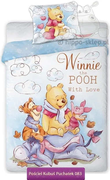 Pościel Kubuś Puchatek i przyjaciele ze stumilowego lasu dla chłopców. Oryginalny licencyjny komplet pościeli bawełnianej z Kubusiem Puchatkiem oraz postaciami nierozłącznych przyjaciół: Tygryska, Kłapouchego oraz Prosiaczka. Komplety Pościeli z Kubusiem Puchatkiem i jego towarzyszami w jasnej błękitnej kolorystyce z motywami chmurek i liści oraz dużym napisem "Z miłości do Kubusia Puchatka" (From Winnie the Pooh With Love). Rewers pościeli w błękitnej kolorystyce z motywami liści, powłoczka na poduszkę z postacią Kubusia i motywami czerwonych serduszek. Pościel Kubuś Puchatek i Przyjaciele 140x200 lub 135x200 cm a także pościel Kubuś Puchatek i osiołek na wymiar 140x180, 140x160 lub 120x160 cm w zależności od wybranej opcji z jedną poszewką na poduszkę 70x80, 50x80 lub 50x60 cm w komplecie. Komplety pościeli z postaciami z filmów o Kubusiu Puchatku zapinane na suwak, wykonane ze 100% bawełny z certyfikatem Oeko-Tex standard 100 z materiałów bezpiecznych dla dzieci. Pościel Kubuś Puchatek i przyjaciele na licencji Disney, z oficjalnej kolekcji. Delikatna błękitna kolorystyka doskonale sprawdzi się w jasnych sypialniach chłopca lub dziewczynki. Producent Faro, model Pościel dziecięca Kubuś Puchatek i przyjaciele 083, ean 5907750585519 (140/200)