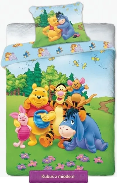 Pościel Kubuś Puchatek miodek oryginalna licencyjna pościel z Kubusiem Puchatkiem, Tygryskiem, Osiołkiem, Prosiaczkiem i Maleństwem na łące. Bawełniana pościel dziecięca Kubuś Puchatek z bohaterami ze stumilowego lasu na licencji Disney Winnie The Pooh. Pościel Kubuś Puchatek 140x200, 160x200 cm, oraz komplety pościeli z Puchatkiem w rozmiarach niestandardowych 150x200 (Ikea) i 135x200 cm (Jysk) oraz 140x180 z jedną powłoczką na poduszkę 50x60, 50x80 lub 70x80 cm w zależności od wybranego wariantu i opcji rozmiaru. Komplet pościeli z Kubusiem Puchatkiem Disneya zamykana na suwaki, ze 100% bawełny gładkiej, certyfikowana według Oeko-Tex 100 gwarantujący wykonanie jej z przebadanych i atestowanych materiałów bezpiecznych dla dziecka. Duże i wyraźne postacie bohaterów bajek i opowiadań o Puchatku nadrukowane na pościeli sprawią, że maluchy będą z przyjemnością układać się do snu. Pościel Kubuś Puchatek 160x200 lub 140x200 cm to wspaniały pomysł na prezent dla chłopca i dla dziewczynki małego i większego wielbiciela Kubusia i przygód jego przyjaciół. Pościele Kubuś Puchatek Disney w zielonej kolorystyce z dużymi postaciami bohaterów, zapakowany w estetyczne opakowanie, świetnie sprawdzi się jako prezent. Producent pościel Faro, model Pościel Kubuś Puchatek na łące 02, wz 790 no 02 ean 5904003370014 (140/200), 5904003371561 (160/200)