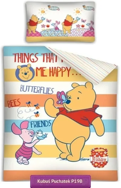 Pościel Kubuś Puchatek P19B pościel dla niemowlaka i malucha z postaciami Kubusia Puchatka i Prosiaczka znanych z animowanych filmów i seriali o przygodach przyjaciół w stumilowym lesie. Pościel do łóżeczka z Kubusiem Puchatkiem lub małego łóżka dla dzieci w wieku od 0 do 5 lat na licencji Disney -a (Winnie the Pooh) składająca się z poszewki na poduszkę o wymiarach 40x60 cm i poszwy na kołdrę o wymiarach 100x135 cm, zamykane na suwaki. Pościel Kubuś Puchatek dla niemowlaków i maluchów z bawełny 100%, wyprodukowana zgodnie z Oeko-Tex standard 100 posiada pozytywną opinie IMiD z Łodzi. Pościel dla maluchów Kubuś Puchatek w żółto pomarańczowo niebiesko białe pasy z postaciami z bajki o Kubusiu Puchatku rozweseli sypialnie malucha i pozwoli im zasypiać w towarzystwie ulubionych postaci z bajek. Producent pościel Detexpol, model Mała pościel dziecięca Kubuś Puchatek WTP 19B, ean 5901685607698