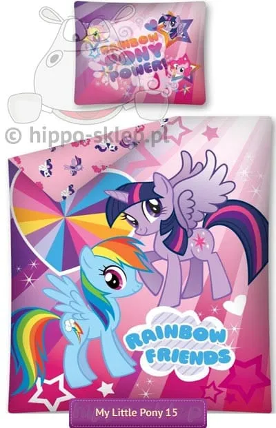 Pościel kucyki Pony Przyjaźń to Magia 15 z postaciami Twilight Sparkle oraz Rainbow Dash tęczowych kucyków z Ponyville z królestwa Equestrii. Pościel dla dziewczynek z bohaterkami filmu Przyjaźń to magia (Friendship is Magic) w dwóch wersjach rozmiaru poszwy na kołdrę: 140x200 cm albo 160x200 cm i jedną poszewką na poduszkę 70x80 cm, poszewka na kołdrę i poduszkę są zapinana na guziki. Pościel z Kucykami wykonana ze 100% bawełny, na licencji Hasbro, posiada certyfikat OEKO-TEX standard 100 gwarantujący wykonanie z bezpiecznych surowców dla skóry. Idealny upominek dla dziewczynek uwielbiających postacie tęczowych kucyków i serial o ich przygodach. Producent Detexpol, model Pościel dla dzieci Kucyki Pony MLP 15DC