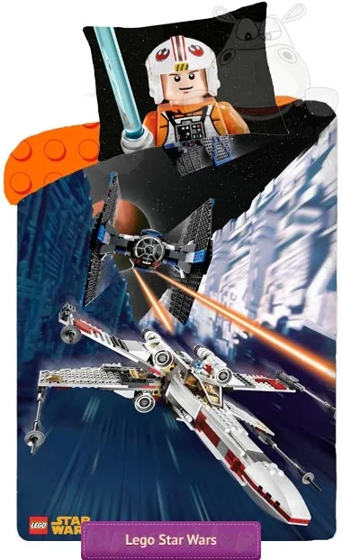 Pościel Lego Star Wars przedstawiający kosmiczną walkę modeli statków powietrznych wykonanych z klocków LEGO. Komplet pościeli dziecięcej LEGO Star Wars z wizerunkiem uciekającego statku powietrznego sił Rebeliantów X-wings Incom T-65 przed ostrzałem TIE Fighterem sił Imperium. Komplet pościeli dla dzieci z Lego Star Wars w kolorystyce niebiesko srebrnej z postacią pilota sił rebelii z jasno niebieskim mieczem świetlnym na powłoczce na poduszkę i pomarańczowym rewersem w tradycyjne piny klocków LEGO. Komplet pościeli dziecięcej Lego Star Wars dla chłopca na jednoosobowe łóżko dziecięce, na licencji LEGO® wyprodukowana ze 100% gładkiej bawełny naturalnej według wytycznych Oeko-Tex standard 100, zapinana na suwaki. Pościel Lego Star Wars 140x200 lub 135x200 cm w zależności od wybranego wariantu rozmiaru oraz jednej powłoczki 70x80 cm w komplecie. Pościel dziecięca z Lego Star Wars to idealny pomysł na upominek dla małego fana fantastyki spod znaku Gwiezdnych Wojen, statków kosmicznych i przygód bohaterów Star Wars. Producent pościel Character World, model Pościel dla dzieci Lego Star Wars LEG 191BL, ean 5055285403102