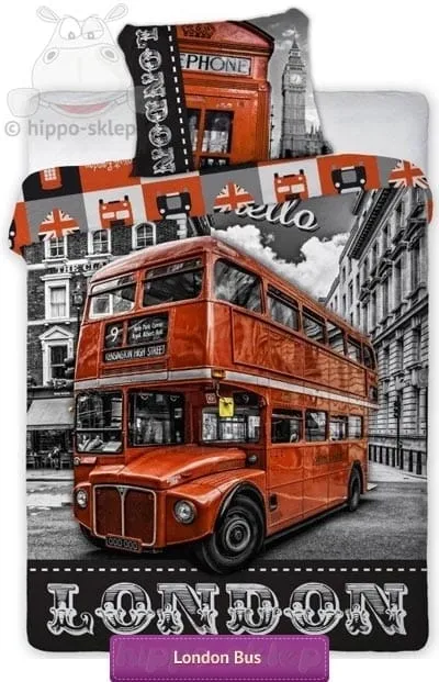 Pościel Londyn dla nastolatków w stylu retro. Pościel młodzieżowa z najbardziej rozpoznawalnymi starymi symbolami stolicy Wielkiej Brytanii piętrowego autobusu AEC Routemaster na tle zabudowy centrum Londynu na poszwie oraz czerwonej budki telefonicznej z nieodłącznym i charakterystycznym symbolem miasta Big Ben -em w tle na poszewce. Komplet pościeli Londyn 140x200 lub 135x200 cm na łóżko pojedyncze lub pościel Londyn 160x200 albo 150x200 cm na łóżko podwójne w zależności od wybranej opcji rozmiaru z jedną poszewką 70x80 cm w komplecie. Pościel młodzieżowa Londyn zapinana na suwaki, wykonana ze 100% bawełny gładkiej posiada certyfikat Tekstylia godne zaufania Oeko-Tex standard 100. Pościel z symbolami Londynu to świetny pomysł na praktyczny prezent dla nastolatków gustujących w stylu vintage. Producent Faro, model Pościel młodzieżowa City 02 - Londyn, ean 5907750527854 (160/200), 5907750540235 (140/200)
