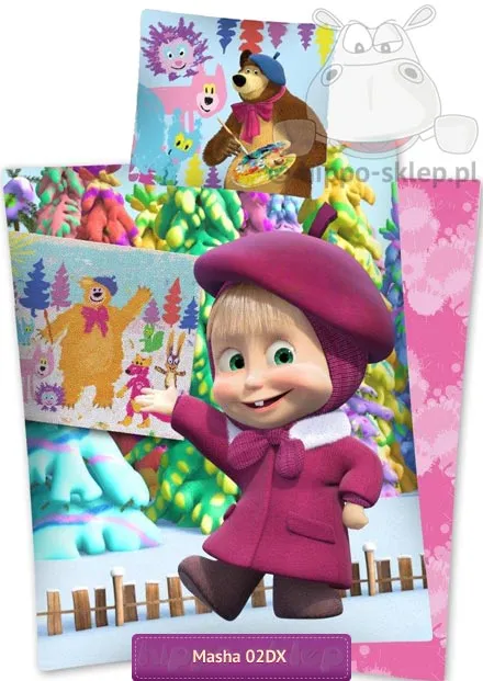 Pościel z Maszą i Niedźwiedziem bohaterami rosyjskiego filmu animowanego dla najmłodszych dzieci z małą dziewczynką o imieniu Masha oraz opiekującym się nią niedźwiedziem cyrkowym. Pościel dla dzieci z duża postacią Maszy w zimowej scenerii na poszwie oraz malującym obrazy Misiem na poszewce w rozmiarach 140x200, 160x200, 150x200 a także 135x200 cm w zależności wybranej opcji z jedną powłoczką na poduszkę o wymiarach 70x80 cm. Pościele Masha and the Bear zapinana na suwaki, z gładkiej 100 % bawełny, certyfikowana zgodnie z Oeko Tex standard 100 - Tekstylia godne zaufania, wyprodukowana z materiałów bezpiecznych dla dzieci. Praktyczny upominek dla małych fanek filmu o ciekawej świata i uwielbiającą zabawę i psikusy małej dziewczynce. Producent Detexpol, model Pościel Masza i Niedźwiedź 02 zima