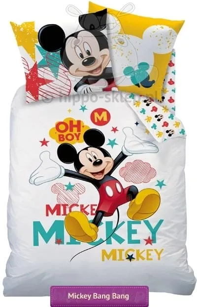Pościel Mickey bang 140x200 z dużą postacią Myszki Miki z filmów animowanych o przygodach małej myszki Mickey (Disney Mickey Mouse). Komplet pościeli dziecięcej na licencji Disney -a w rozmiarze poszewki na kołdrę 140x200, 140x180, 140x160 oraz 120x160 lub 100x160 cm, poszewka na poduszkę 50x60 cm lub 63x63 cm. Dostępna także niestandardowa pościel Myszka Miki 100x160 z poszewką 50x60 cm. Zamknięcie poszwy i poszewki na zakładkę (zamknięcie kopertowe), wyprodukowana z gładkiej tureckiej bawełny 100%. Pościel z myszką Mickey posiada certyfikat jakości Oeko-Tex 100 gwarantujący wykonanie z materiałów bezpiecznych dla skóry. Piękna pościel Myszka Miki z dużą kolorową postacią to doskonały pomysł na praktyczny prezent dla chłopców i dla dziewczynek. Producent pościeli CTI, model Pościel Myszka Mickey Bang 41430, ean 3272760414305