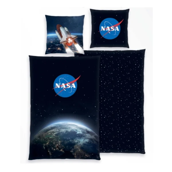 Bawełniany komplet pościeli z logo Amerykańskiej Agencji Aeronautyki zajmującej się badaniem kosmosu na tle widoku Ziemi z przestrzeni kosmicznej z zarysem kontynentów.