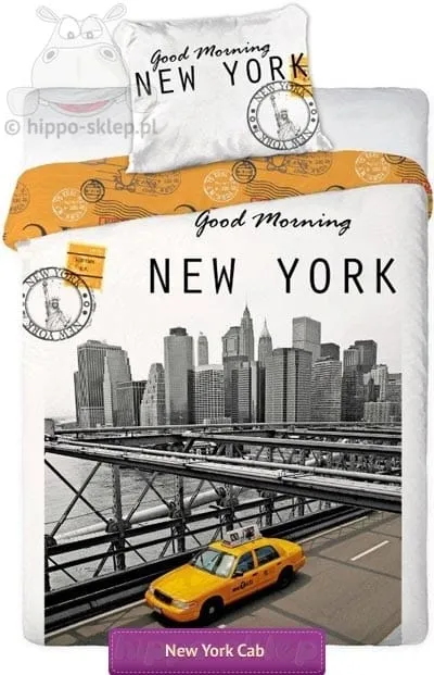 Pościel New York 02 w formie pocztówki z jednym z najbardziej rozpoznawalnych symboli Nowego Yorku - Mostem Brooklińskim (Brooklyn Bridge) oraz drugim nie mniej popularnym żółtą taksówka (Yellow cab). Ciekawe połączenie czarno-białego zdjęcia Manhattanu z mostu łączącego Brooklyn z Manhattanem z żółtą taksówką wyróżniającą się na zdjęciu jako jedyny kolorowy element. Pościel New York dla nastolatków o wymiarach poszwy na kołdrę 140x200, 135x200, 150x200 lub 160x200 cm z jedną lub dwiema poszewkami na standardową poduszkę w rozmiarze 70x80 cm w zależności od wybranego wariantu. Pościel New York z bawełny 100%, poszewki zapinane na suwaki, wykonana zgodnie z obostrzeniami certyfikatu Oeko-tex standard 100 gwarantującego użycie do produkcji tylko bezpiecznych surowców. Pościele New York to świetny pomysł na uzupełnienie wnętrza z symbolami Nowego Jorku lub urządzonego z przewagą czarno białych kolorów. Producent pościele młodzieżowe Faro, model Pościel młodzieżowa City 01 - New York, ean 5907750527847 (160/200) 5907750540228 (140/200)